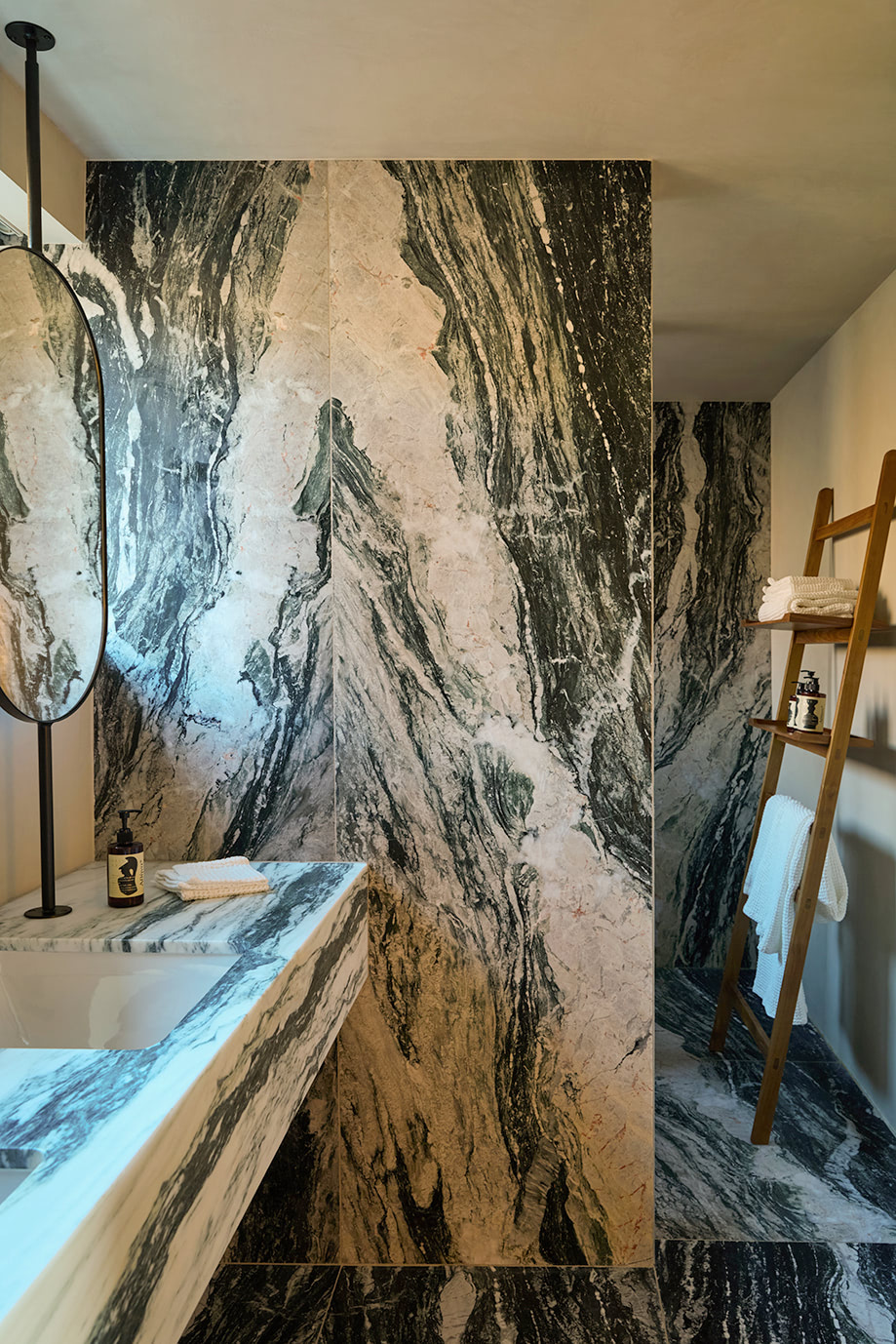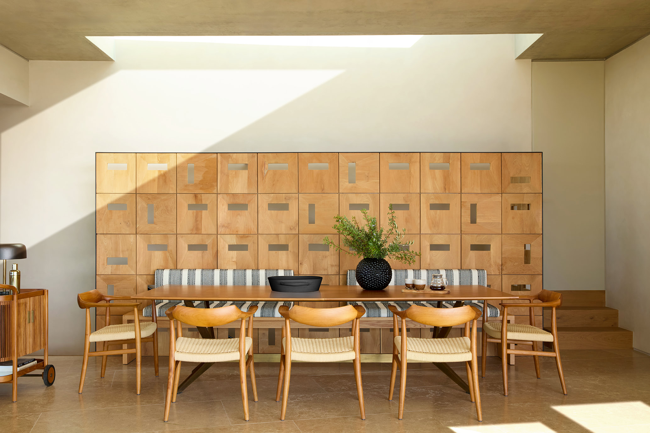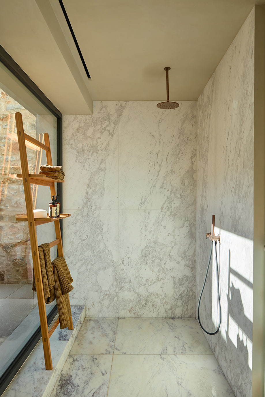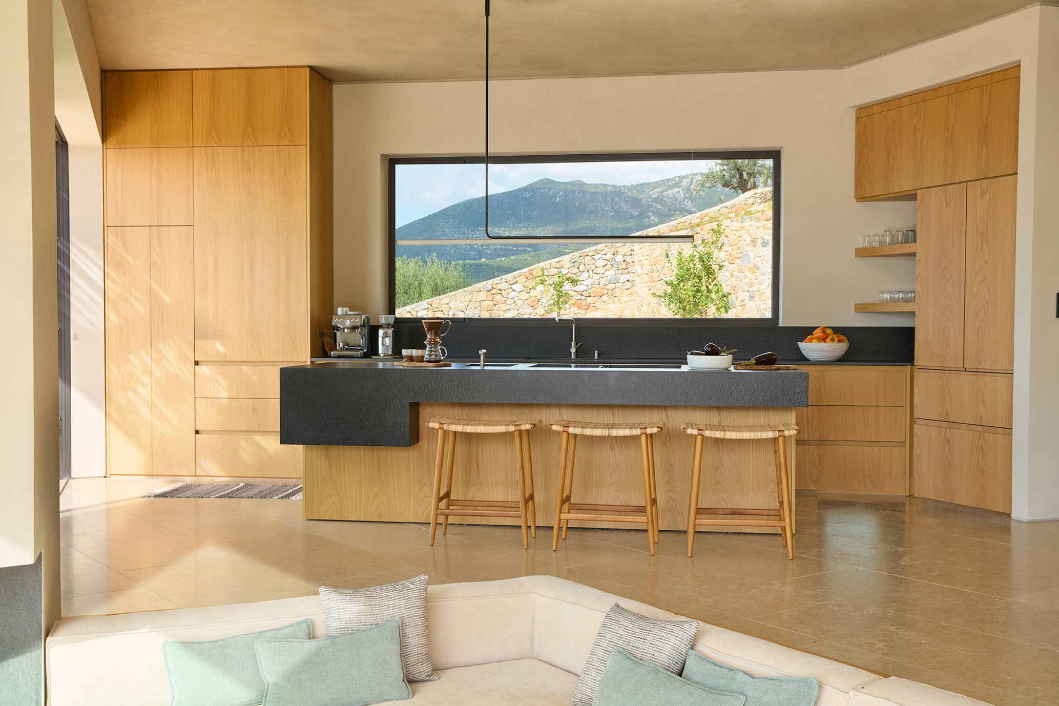 Designed as a modern Shangri-La for its owners and their extended family, the residence harmoniously merges locally quarried stone with clean contemporary lines, unfolding across the hillside in carefully articulated fragments rather than a single mass. This fragmented composition not only allows the home to settle naturally into the terrain but also creates a rich variety of viewpoints and spatial experiences throughout the property.
