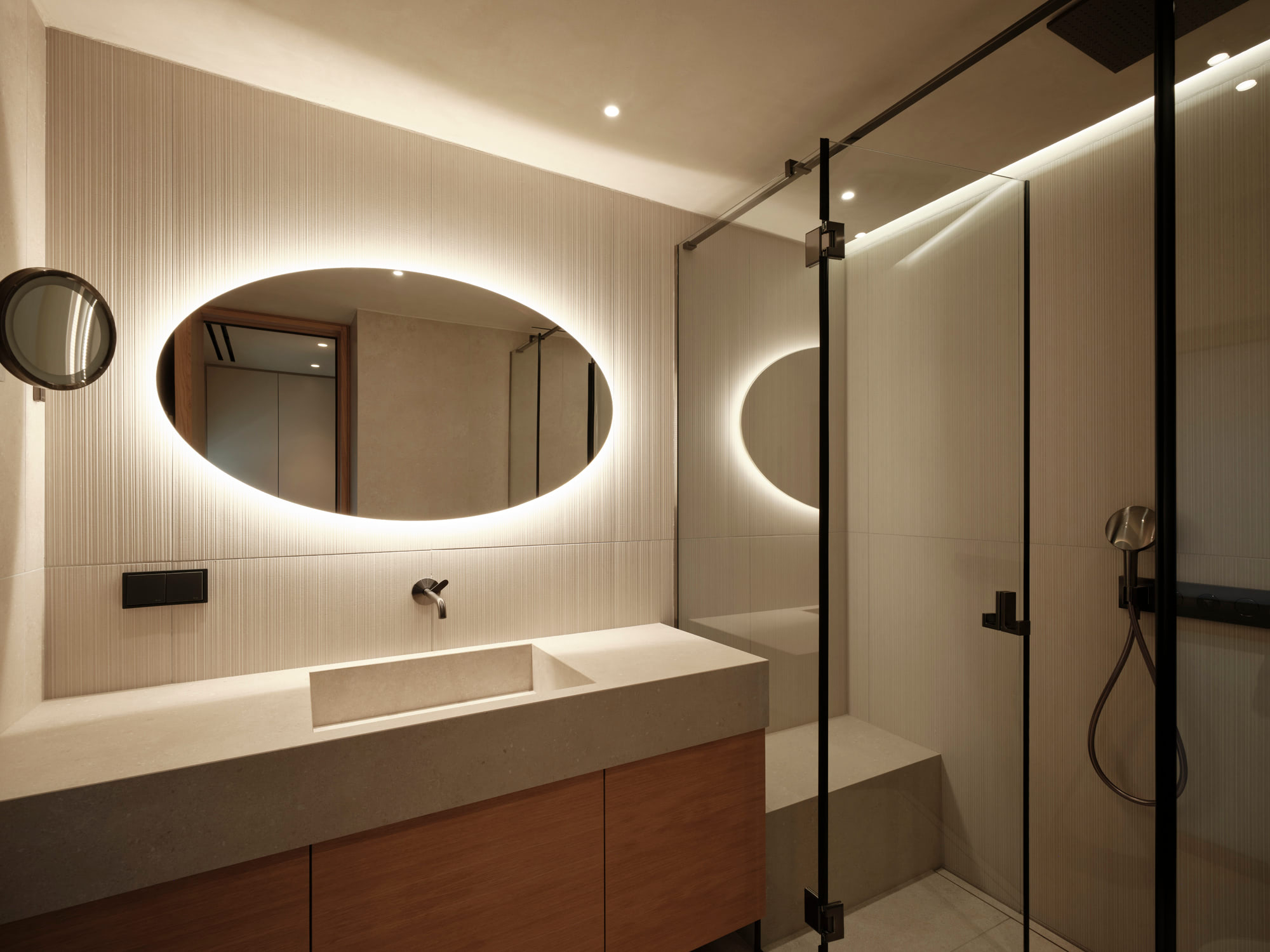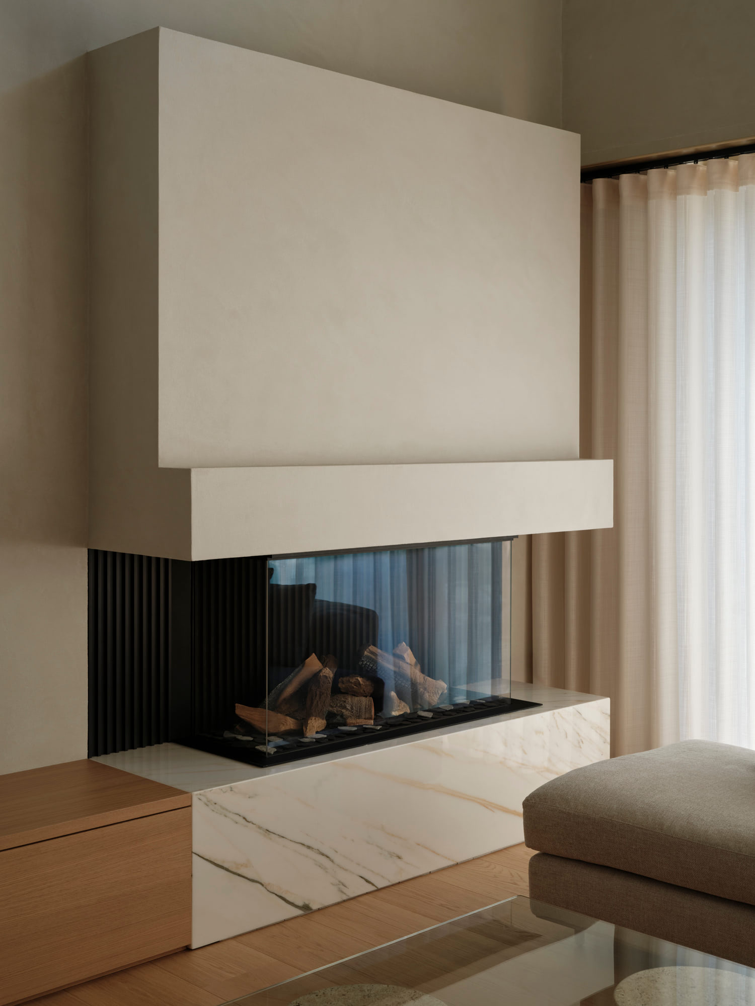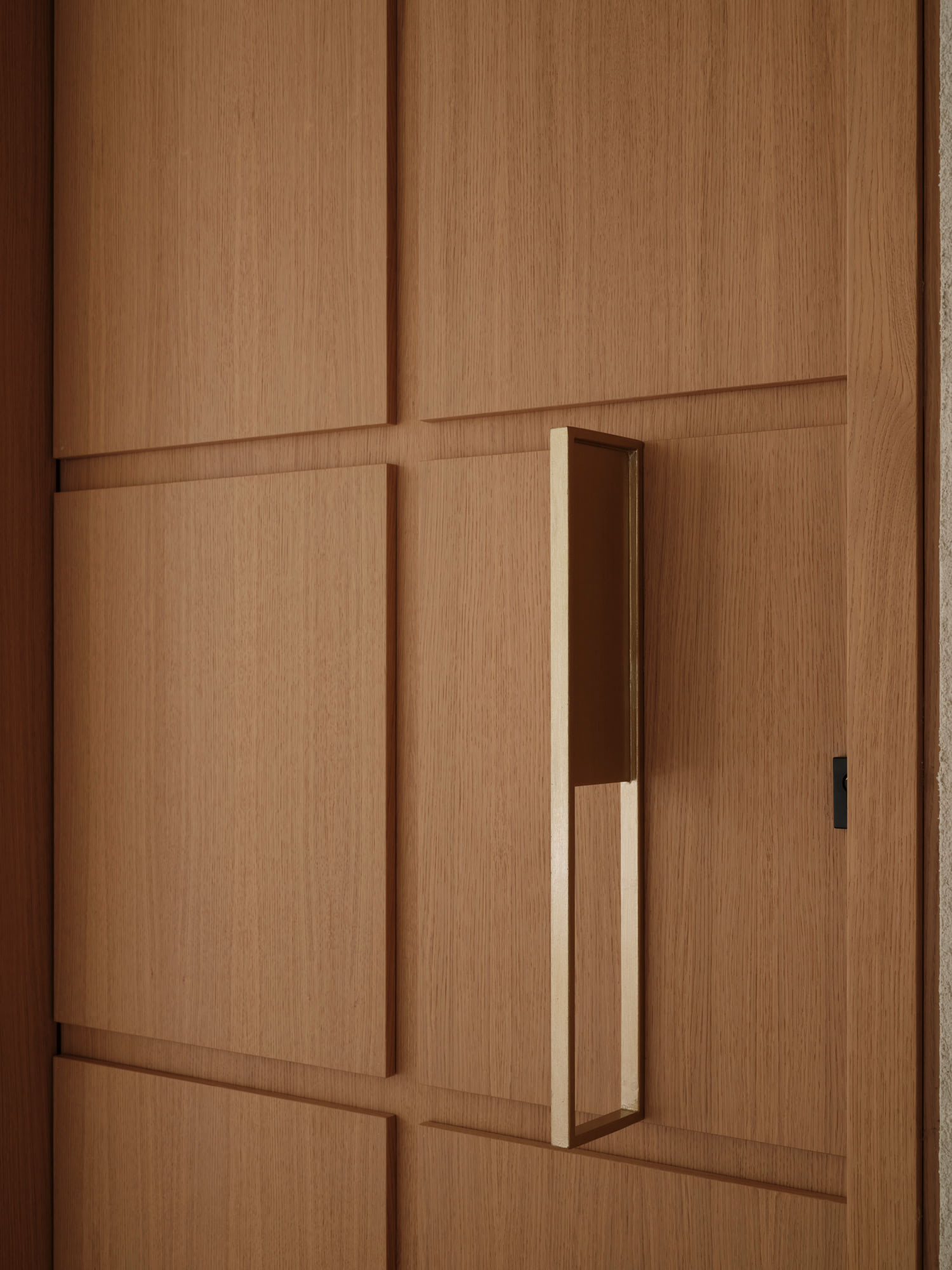 The material palette balances elegance with restraint. Cool, veined marble converses effortlessly with warm oak wood, creating a rhythm that is both refined and understated. Lacquered wood cabinetry in the kitchen and bedrooms—finished in harmonious, muted tones—adds a subtle layer of colour and polish, blending seamlessly into the overall composition. This interplay of textures and tones brings a quiet sophistication to the home, where tradition and modernity coexist with ease.