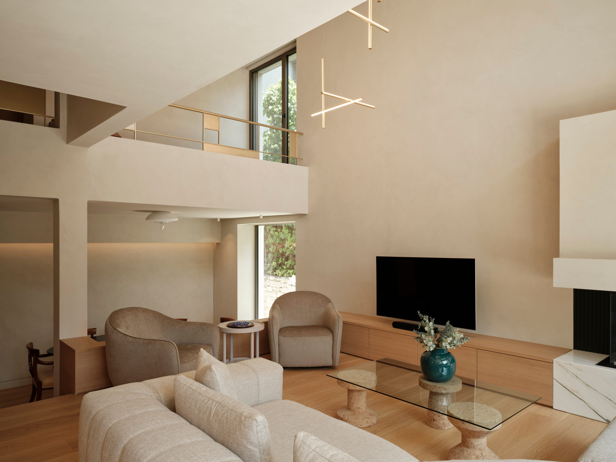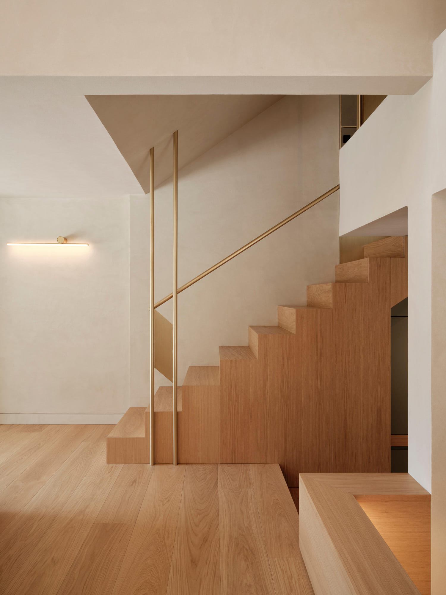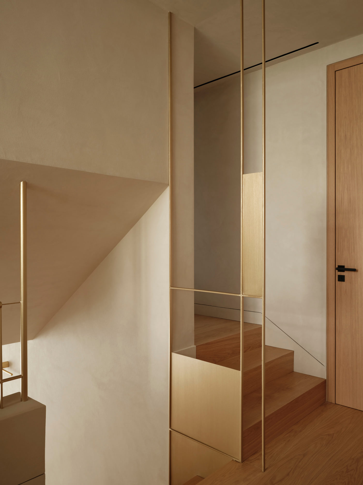 A key element of the design lies in the tactile quality of the surfaces. The walls, finished in a breathable, natural-textured plaster, soften the light and give the space a calm, earthy atmosphere. Every detail is crafted with intention—from the custom-forged door knobs to the finely detailed staircase railing—inviting touch and reinforcing the sense of craftsmanship.