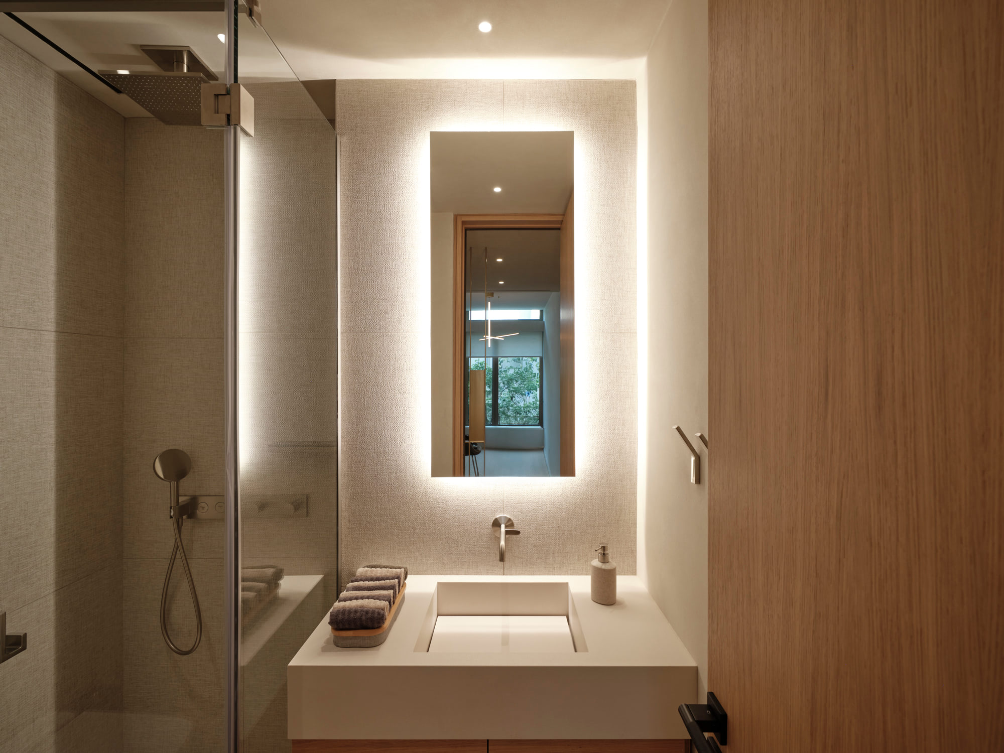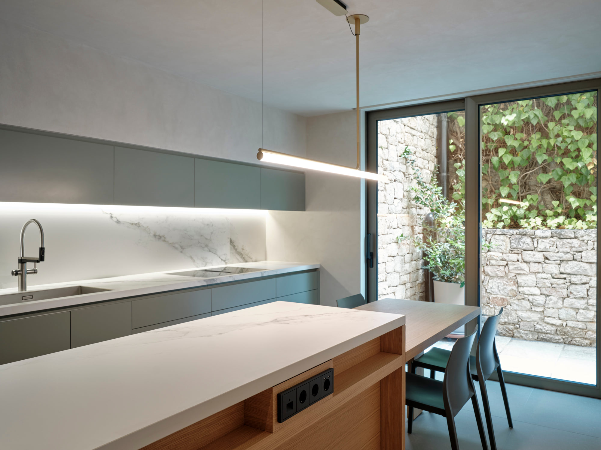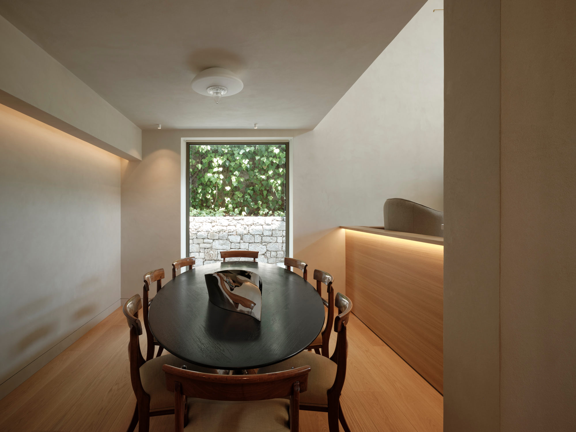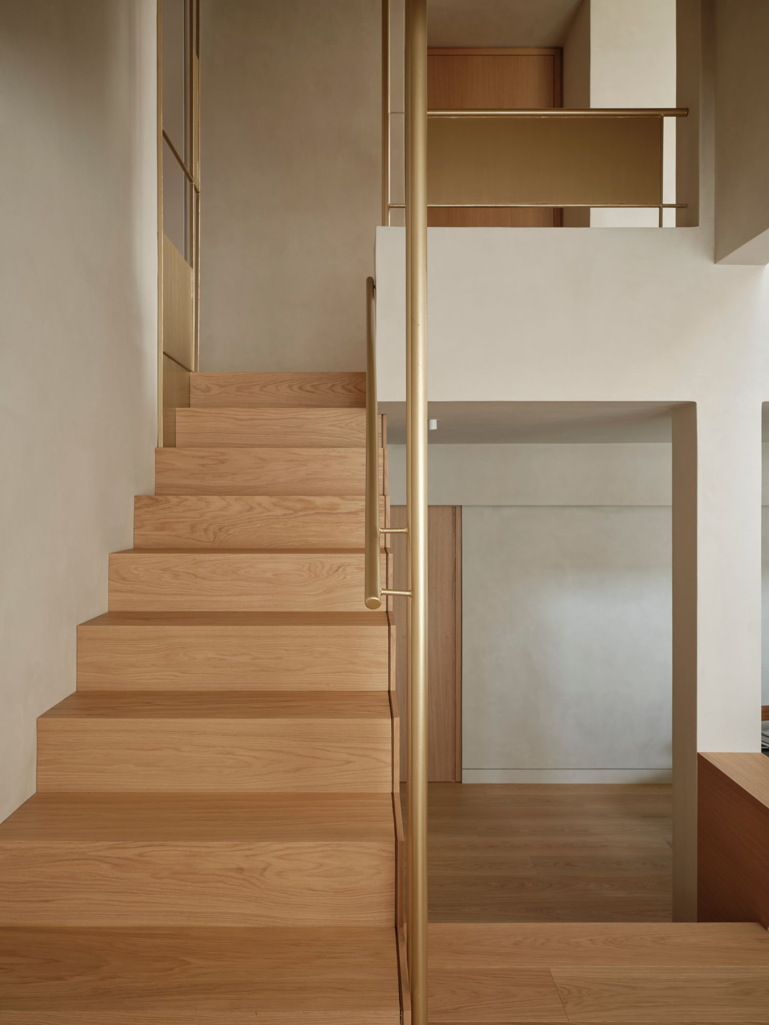 A key element of the design lies in the tactile quality of the surfaces. The walls, finished in a breathable, natural-textured plaster, soften the light and give the space a calm, earthy atmosphere. Every detail is crafted with intention—from the custom-forged door knobs to the finely detailed staircase railing—inviting touch and reinforcing the sense of craftsmanship.