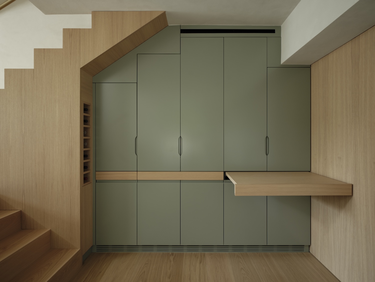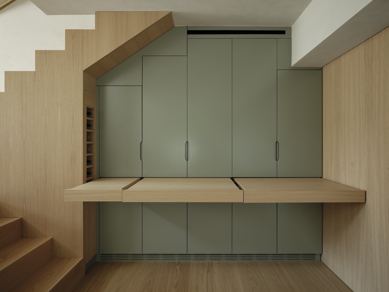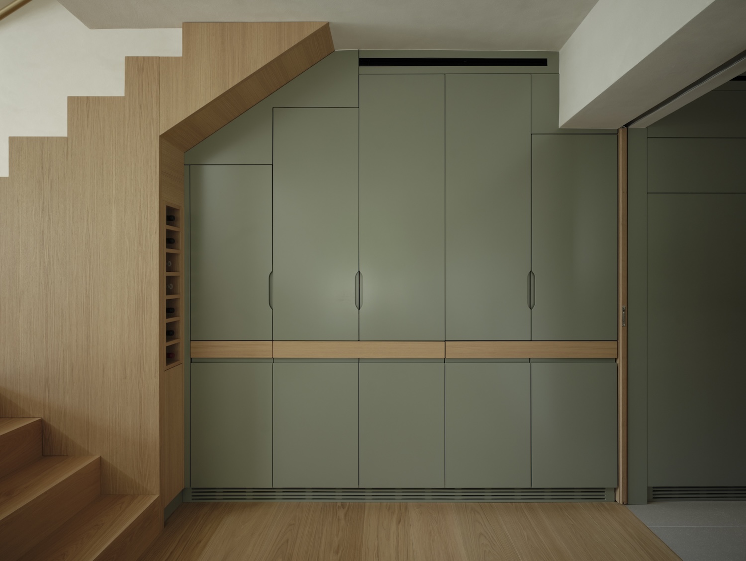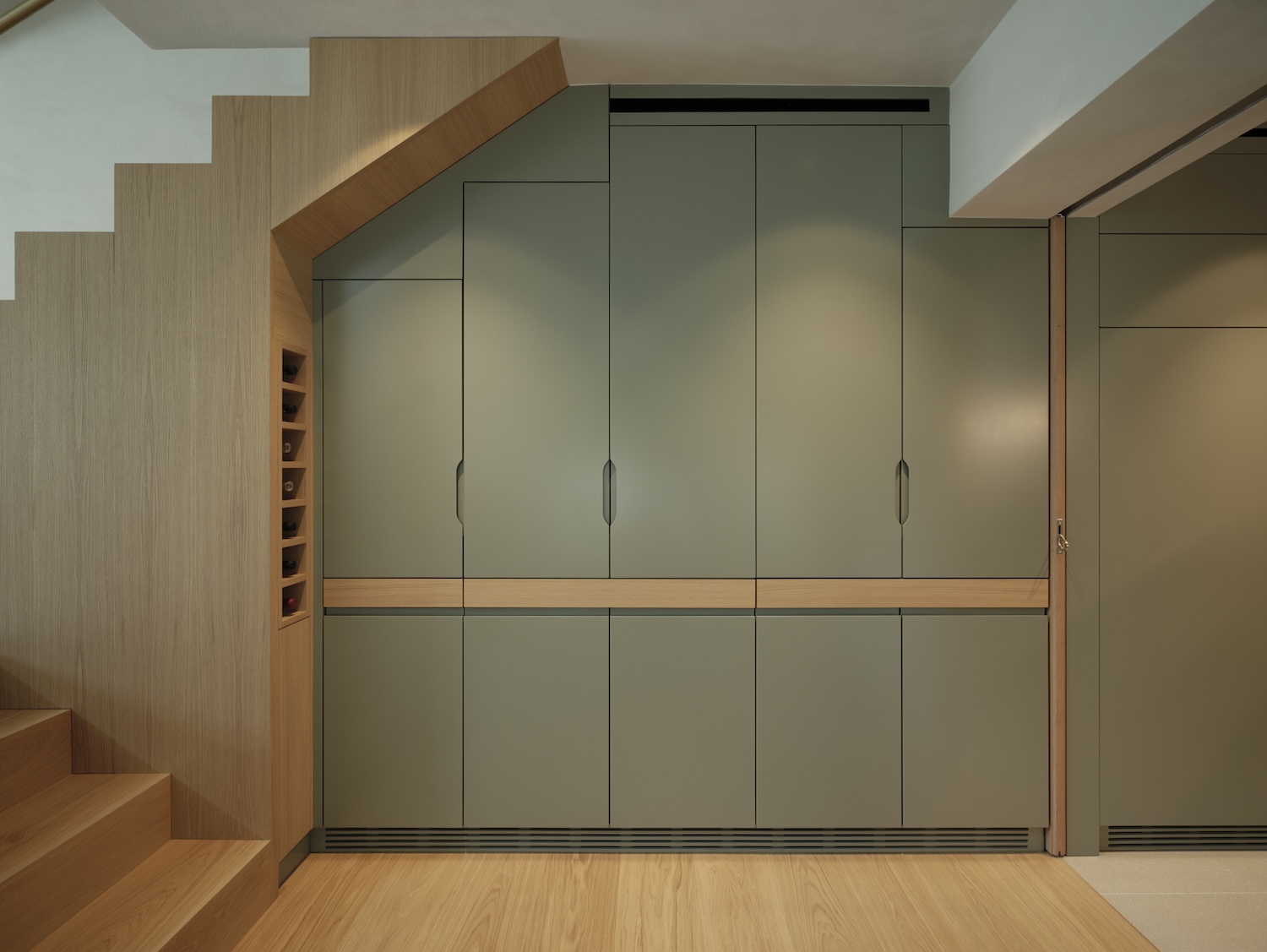 The material palette balances elegance with restraint. Cool, veined marble converses effortlessly with warm oak wood, creating a rhythm that is both refined and understated. Lacquered wood cabinetry in the kitchen and bedrooms—finished in harmonious, muted tones—adds a subtle layer of colour and polish, blending seamlessly into the overall composition. This interplay of textures and tones brings a quiet sophistication to the home, where tradition and modernity coexist with ease.