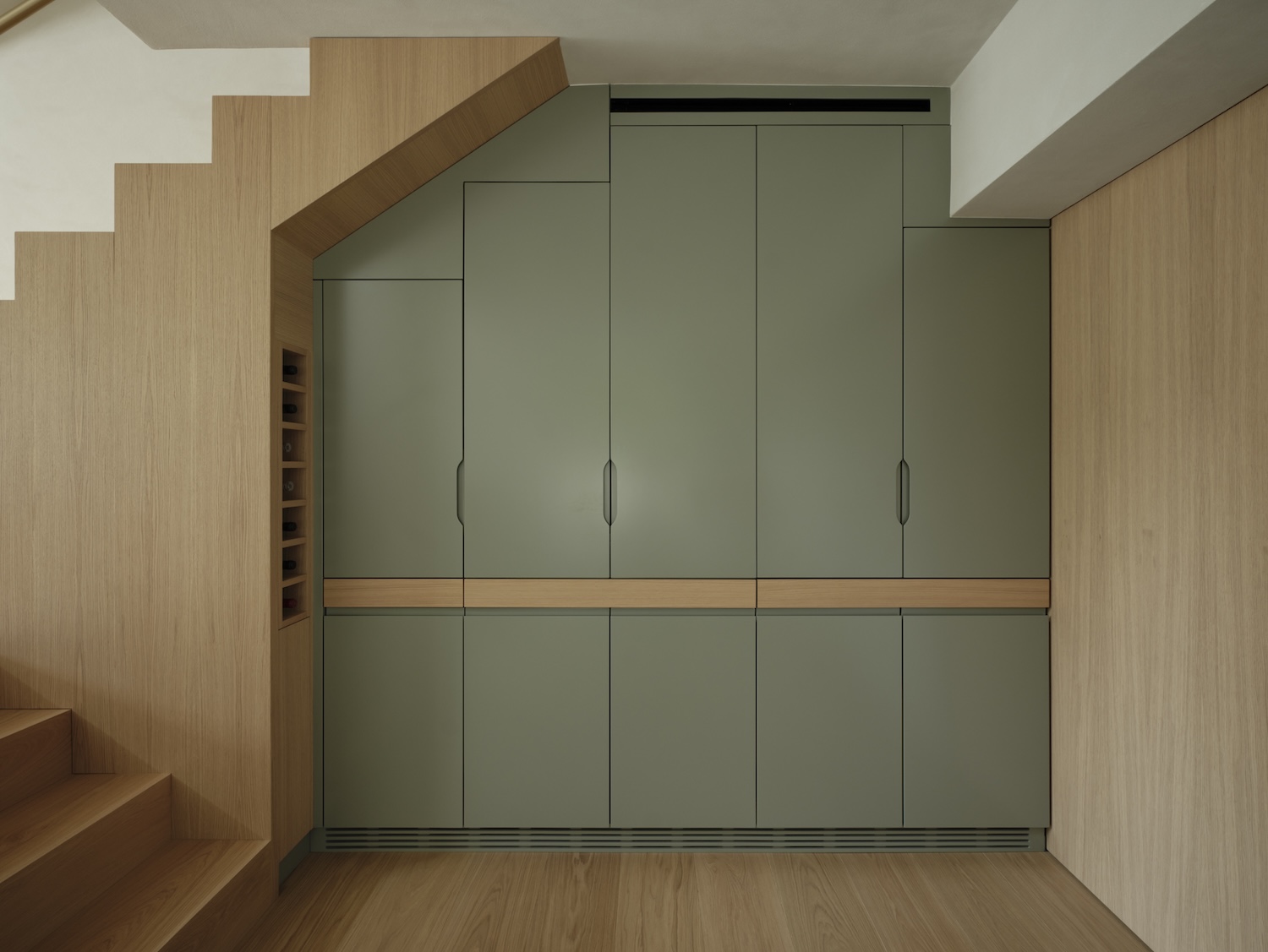 A key element of the design lies in the tactile quality of the surfaces. The walls, finished in a breathable, natural-textured plaster, soften the light and give the space a calm, earthy atmosphere. Every detail is crafted with intention—from the custom-forged door knobs to the finely detailed staircase railing—inviting touch and reinforcing the sense of craftsmanship.